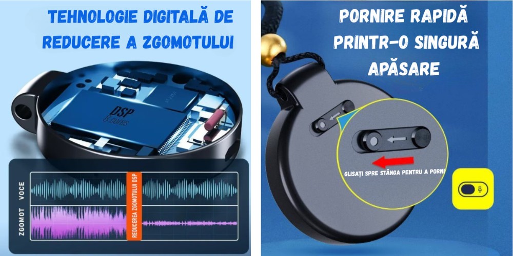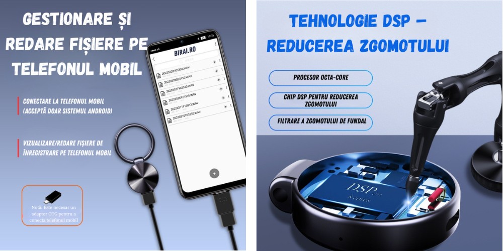 Mini Reportofonul Spion BIRAI® BR30 foloseste procesor DSP de reducere a zgomotului, oferind calitate audio HD, cu voce clara si eliminarea sunetelor de fundal. Ideal pentru intalniri, cursuri, conferinte sau inregistrari confidentiale.