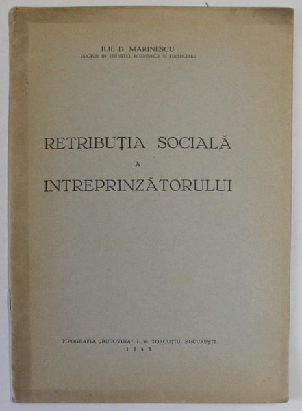 RETRIBUTIA SOCIALA A INTREPRINZATORULUI de ILIE D. MARINESCU , 1946 , DEDICATIE *