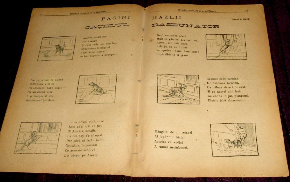 "Revista copiilor si tinerimei" Nr 20/1921 (26 mai) - revista pentru copii si tineret editata de jurnalistul C.G. Costa-Foru (activist pentru drepturile omului) si Maria Edeleanu (fiica sa). Revista are 16 pagini in format 19,5 cm x 27,5 cm si contine la interior desenele ilustratorului roman Marin Iordache (pseudonimul artistic al lui Marin Iorda). Mijlocul revistei este destinat benzii desenate cu titlul "Catelul razbunator" (pe doua pagini) - realizare din prima perioada a istoriei BD din Romania.