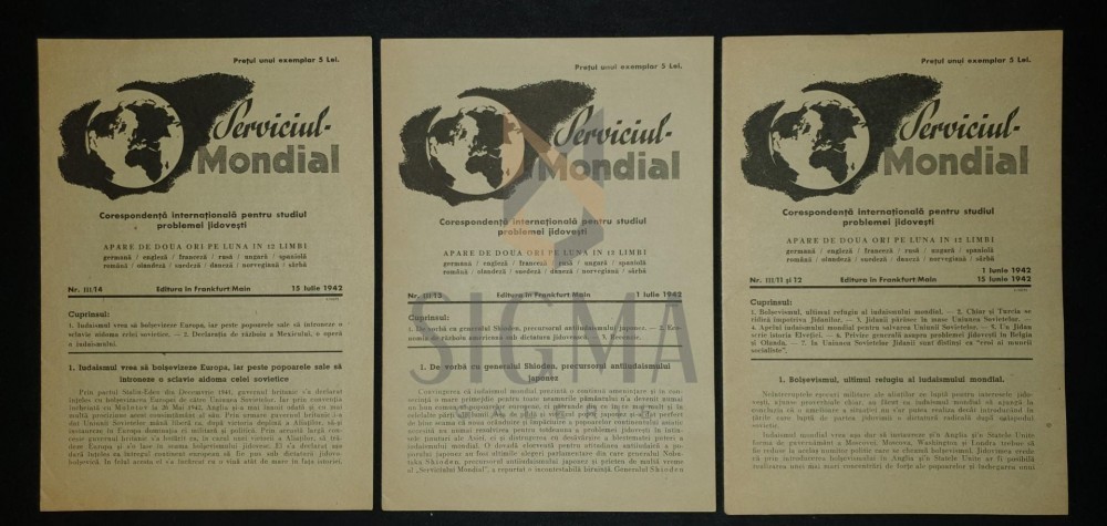 21 X 15 CM , APARE DE DOUA ORI PE LUNA.,IN 12 LIMBI, 3 NUMERE, NR. 11-12, 13, 14, OLANDA - BOLSEVISMUL, ULTIMUL REFUGIU AL IUDAISMULUI, DE VORBA CU GENERALUL SHIODEN , PRECURSORUL ANTIIUDAISMULUI JAPONEZ, IUDAISMUL VREA SA BOLSEVIZEZE EUROPA., ETC 12 PAG+ 12 PAG + 10 PAG.