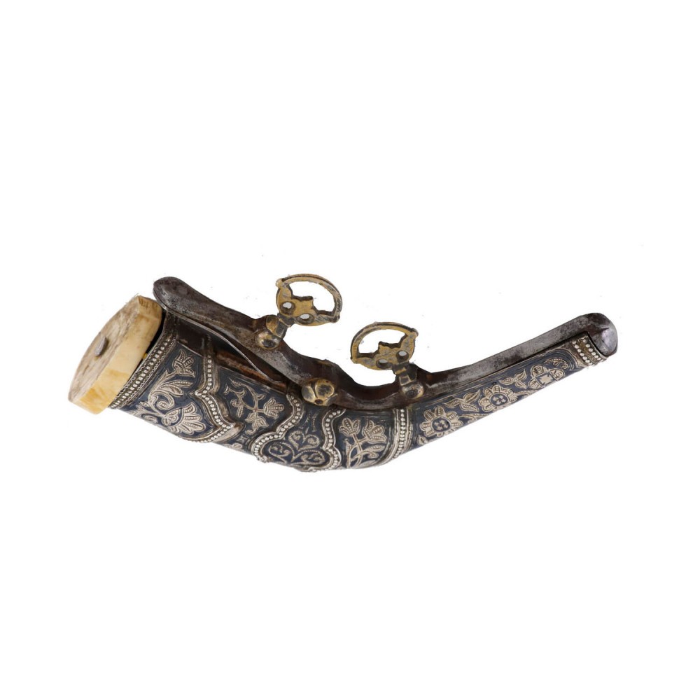 Rezervor de praf de pușcă originar din zona otomană, realizat sub forma unui corn din argint și niello. Rezervorul a fost proiectat cu un mecanism de deschidere al orificiului de alimentare. Acesta a fost decorat pe exterior cu un motiv vegetal, putând fi datat în secolul al XIX-lea.