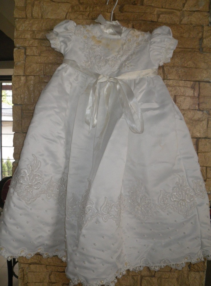 Riochie de mireasa deosebita de la Keepsake USA pentru fetite 0-12 luni ani, patata putin la guler (piept). A fost purtata o singura data cand s-a si patat dealtfel.
