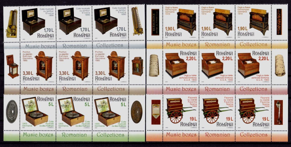 RO 2020 LP 2303 "Colectii Rom. Cutii Muzicale" ,triptic: 3 marci+2 tabs, MNH