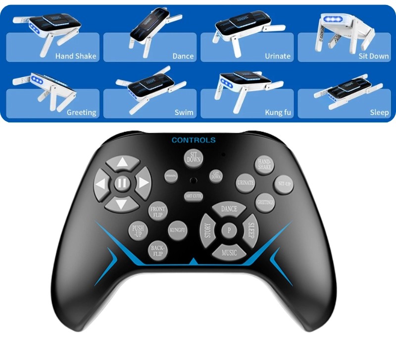 Prin intermediul telecomenzii poate efectua o gama larga de actiuni - sa faca flotari, sa atace in stil de lupta kung fu, sa inoate sau chiar sa danseze si sa redea muzica.