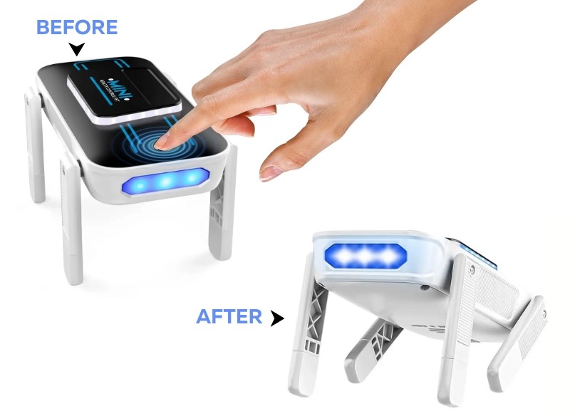 Cand este atins pe cap mini robotul se asaza (Tap to Sit), imitand perfect modul in care un animal de companie real raspunde la comanda "sezi".