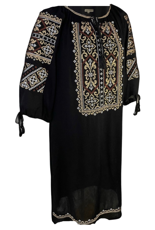 Rochia este dintr-un material bumbac imbogatita cu minunatele flori de floarea soarelui imbinand perfect traditia cu noul, un liant perfect intre motivele traditionale transpuse pe un material atat de modern.