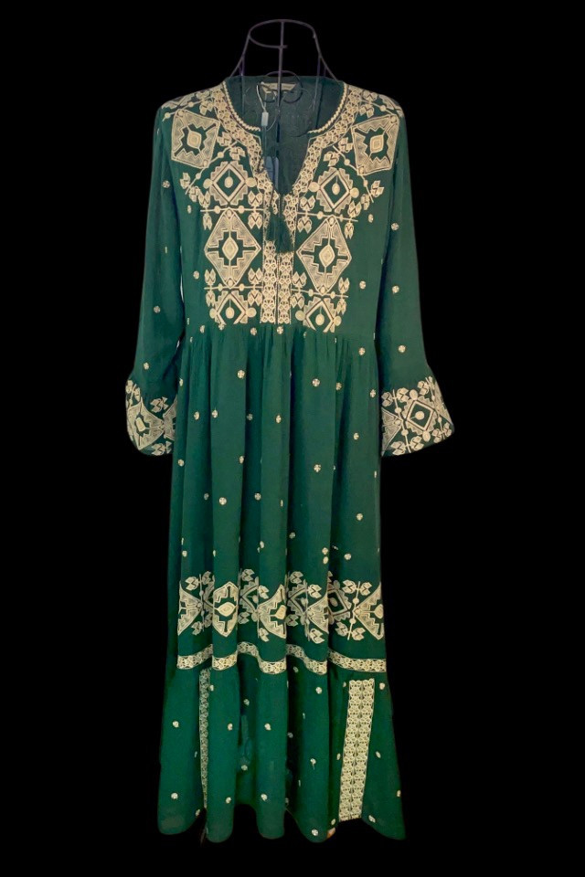 Aceasta rochie verde prezinta un design clasic, cu o lungime care ajunge aproape de zona gleznelor, conferind o nota de rafinament si feminitate. Broderia florala bej adauga un element de frumusete si complexitate, creand un contrast interesant cu fondul verde al rochiei.