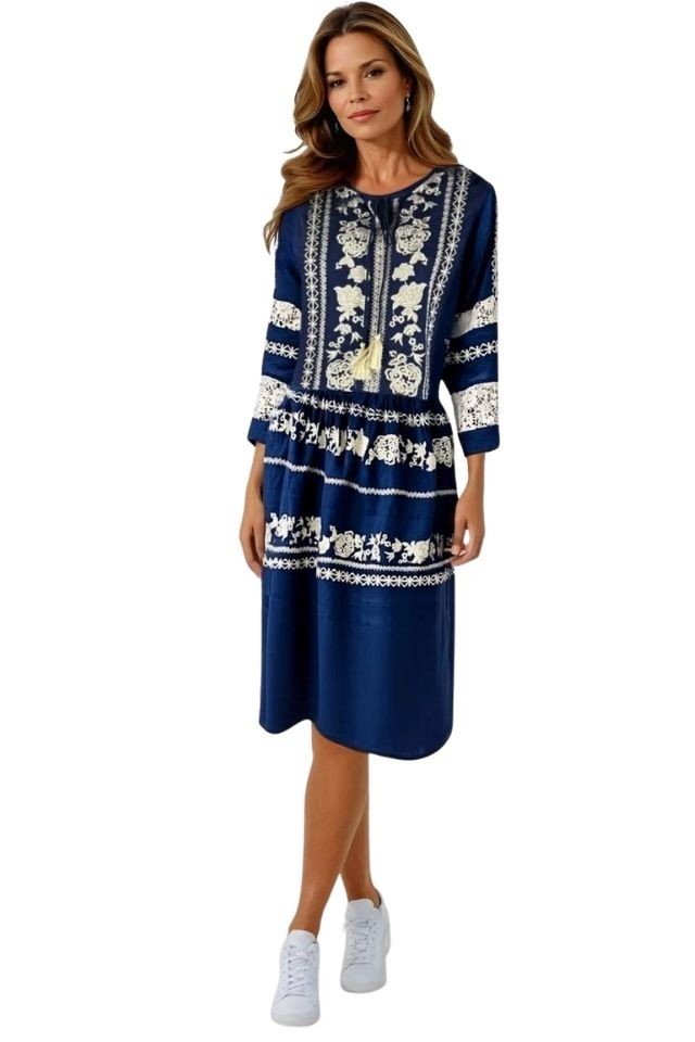 Rochie dama casual RL25 albastru Rochie traditionala albastra dama alegerea inspirata pentru tinutele tale speciale. Rochia este din bumbac 100% si are broderie atat pe maneci cat si piept. Acest model de rochie albastra pentru femei este cu maneca lunga, cu anchior in U. Acest model de rochie albastra traditionala este perfecta pentru tinutele sport casual deoarece imbina perfect traditia romaneasca cu modernitatea . Rochia albastra romaneasca are broderie pe piept si pe maneci cu motive florale colorate Rochiile din bumbac albastre cu motive traditionale romanesti pentru femei sunt la mare cautare si vin sa intregeasca tinutele tale traditionale