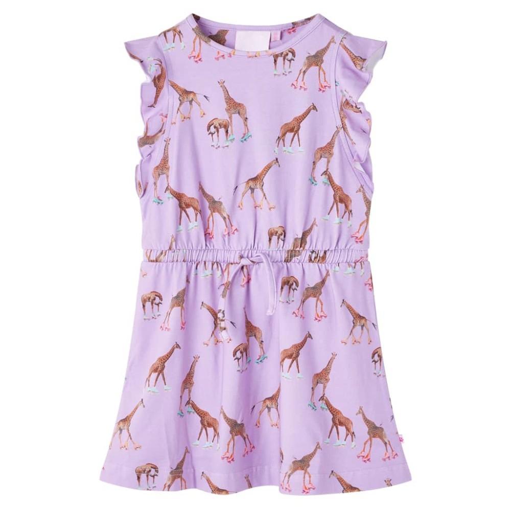 Această rochie pentru copii are un decolteu rotund, mâneci cu volane și o talie elastică cu șnur reglabil. Această rochie pentru copii este imprimată cu girafe pe patine cu rotile peste tot. Rochia scurtă pentru copii este confecționată dintr-un material moale care include 94% bumbac și 6% elastan, pentru confort și respirabilitate.