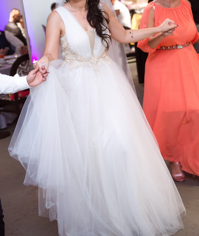 Rochie de mireasa foarte usoara si comoda, facuta pe comanda la atelierul Emily G in Constanta. Marimea e in jur de 40, dar este foarte comoda si usor elastica, cred ca se potriveste si unui 38 si unui 42.