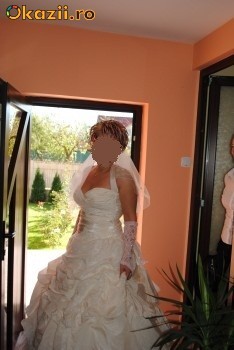 Rochie de mireasa, culoare somon, cu trena, manusi dantela lucrate manual.