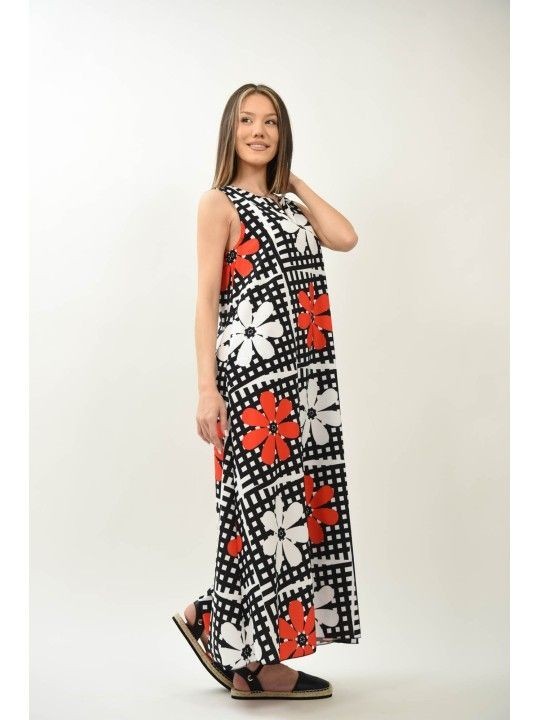Design-ul fără mâneci și fără talie accentuează o siluetă relaxată, în timp ce imprimeurile geometrice în contrast cu florile aplicate îi conferă o personalitate vibrantă. Este rochia perfectă pentru zilele de vară, ușoară și vaporoasă, ideala pentru a fi purtată de la mărimea S la L.