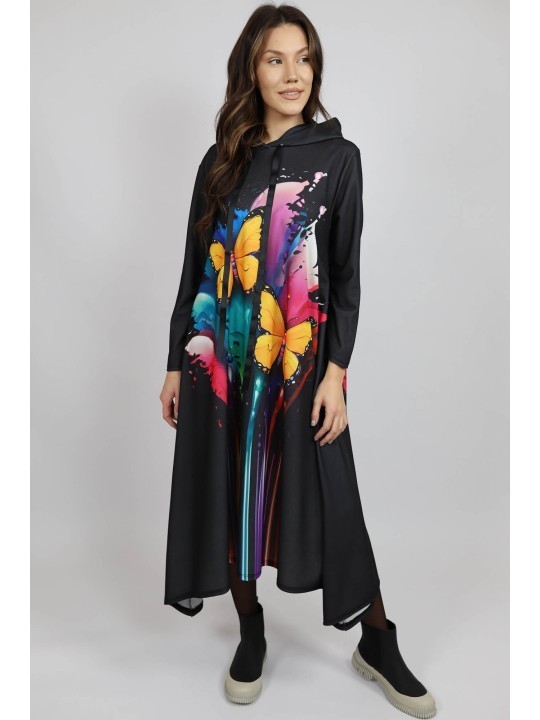 Rochia Maxi Cu Mâneca Lungă Asimetrică Fluture Vallo cu Glugă – Perfectă pentru Toamna 2024