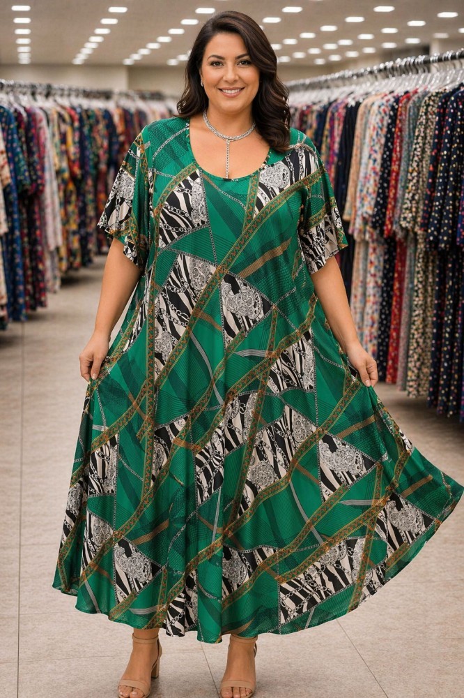 Rochie peste genunchi cu imprimeuri vibrante. Are decolteu pe rotund croi clos. Rochie peste genunchi lungime 120 cm Decolteu normal Maneci scurte Croi clos Fara captuseala Fara inchidere Material: Viscoza Compozitie: 30% Viscoza, 30% Poliamida, 20% Bumbac, 15% Poliester, 5% Elastan *Va rugam verificati eticheta produsului inainte de curatare! *Va rugam sa retineti ca o usoara discrepanta de culoare ar trebui sa fie acceptabila datorita luminii si luminozitatii ecranului. *Marimea este Universala , se incadreaza de la marimea 44 pana la marimea 60 EU.