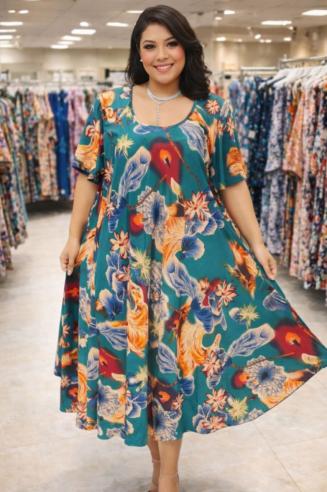 Rochie peste genunchi cu imprimeuri vibrante. Are decolteu pe rotund croi clos. Rochie peste genunchi lungime 120 cm Decolteu normal Maneci scurte Croi clos Fara captuseala Fara inchidere Material: Viscoza Compozitie: 30% Viscoza, 30% Poliamida, 20% Bumbac, 15% Poliester, 5% Elastan *Va rugam verificati eticheta produsului inainte de curatare! *Va rugam sa retineti ca o usoara discrepanta de culoare ar trebui sa fie acceptabila datorita luminii si luminozitatii ecranului. *Marimea este Universala , se incadreaza de la marimea 44 pana la marimea 60 EU.