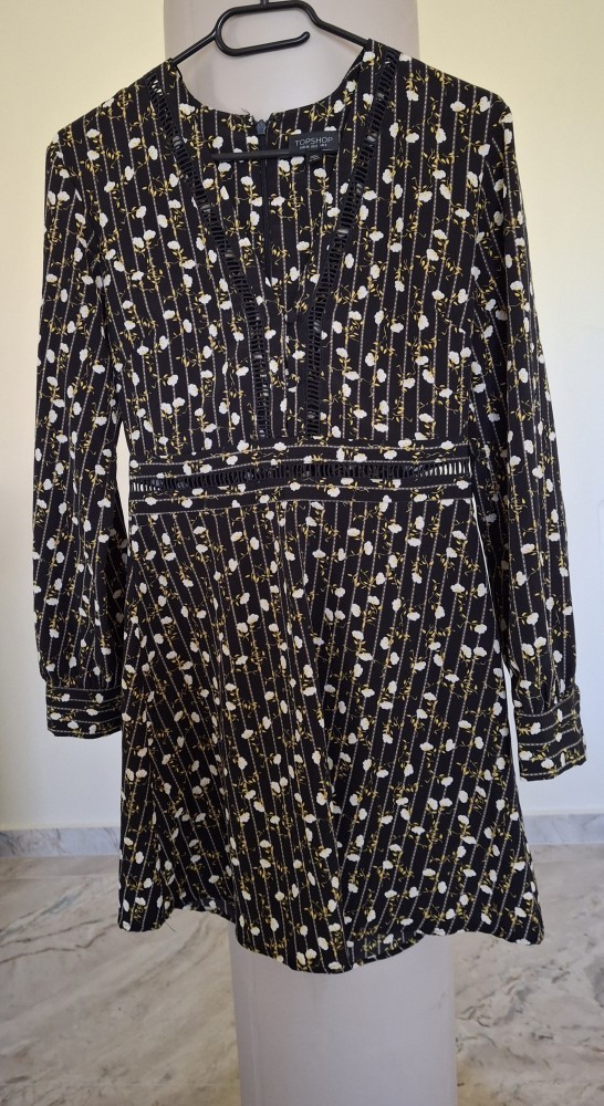 Descriere: Rochie mini florală Topshop, prezintă un imprimeu delicat cu flori albe și galbene dispuse în linii verticale subțiri.