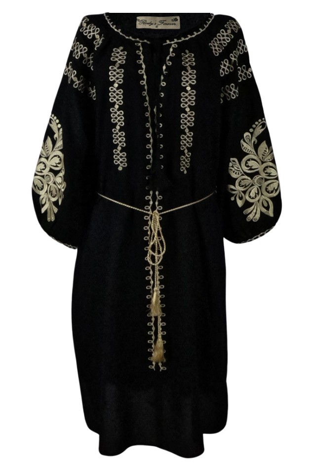Rochie traditionala R24, negru darth vader Rochie traditionala neagra dama alegerea inspirata pentru tinutele tale speciale. Rochia este din bumbac 100% si are broderie atat pe maneci cat si piept. Acest model de rochie neagra pentru femei este cu maneca lunga, cu anchior in U. Acest model de rochie neagra traditionala este perfecta pentru tinutele sport casual deoarece imbina perfect traditia romaneasca cu modernitatea . Rochia neagra romaneasca are broderie pe piept si pe maneci cu motive florale in nuante de bej. Rochiile din bumbac negre cu motive traditionale romanesti pentru femei sunt la mare cautare si vin sa intregeasca tinutele tale traditionale