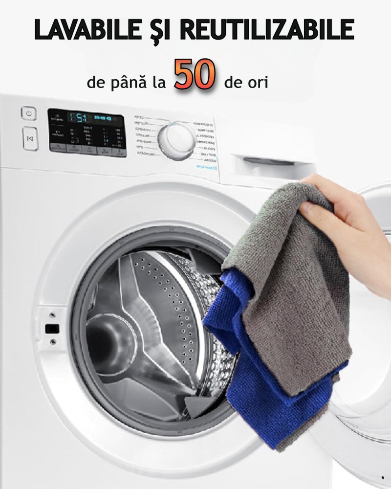 Spalabile in Masina de Spalat: Aceste lavete sunt usor de intretinut, putand fi spalate in masina de spalat de pana la 50 de ori la temperaturi recomandate de maxim 40 de grade Celsius. Este important sa le spalati cu un detergent delicat si sa evitati utilizarea balsamului de rufe, pentru a nu afecta microfibra. Aceasta caracteristica asigura igiena optima si le mentine intotdeauna gata de utilizare. Spalarile repetate nu compromit calitatea sau eficienta lavetelor, pastrandu-le aspectul si functionalitatea pe termen lung.