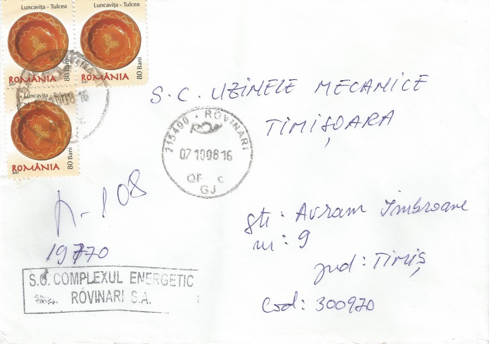 plic recomandat, circulat intern pe ruta Rovinari - Timişoara, 2008