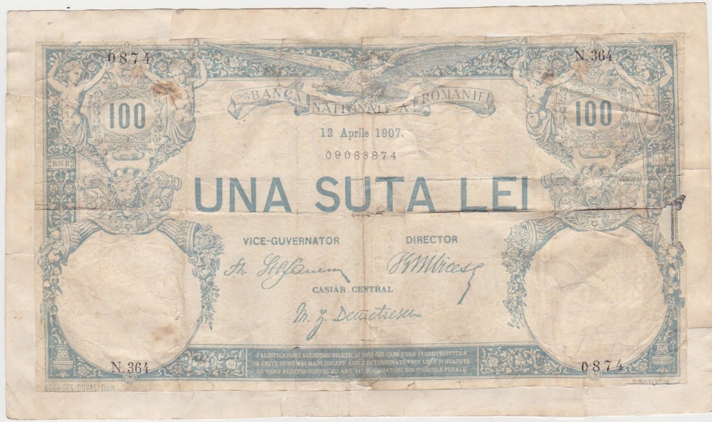 ROMANIA 100 lei Aprilie 1907 UZATA Reparata
