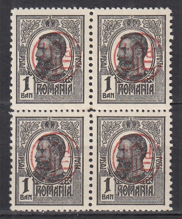 ROMANIA 1918 LP 71 I CAROL I TIPOGRAFIATE 1 BAN NEGRU CU SUPRATIPAR P.T.T.F.F. RANVERSAT SUPRATIPAR RASTURNAT BLOC 4 TIMBRE STARE MNH
