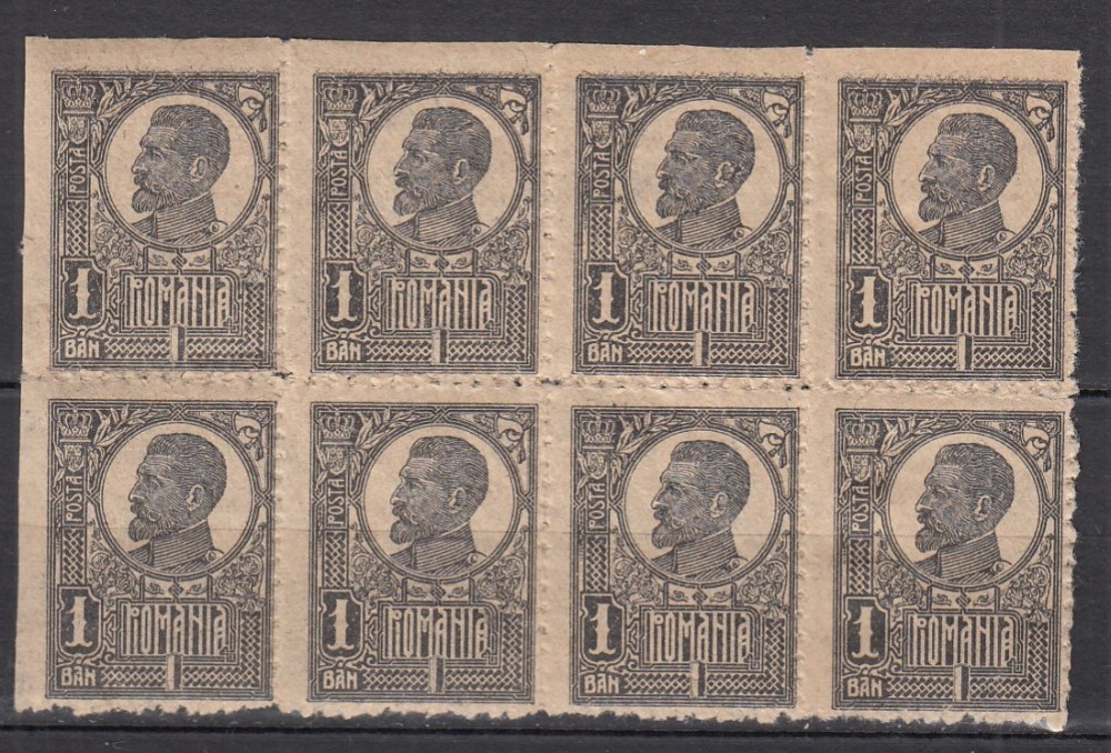 ROMANIA 1919/1922 REGELE FERDINAND BUST MARE 1 BAN NEGRU HARTIE DE RAZBOI EROARE DANTELATURA NEDANTELAT PE DOUA LATURI VERTICAL+ORIZONTAL BLOC DE 8 TIMBRE STARE MNH