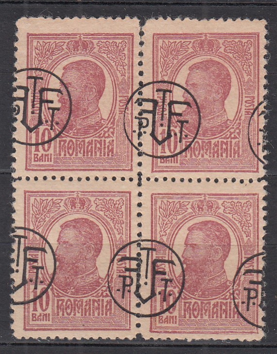 ROMANIA 1919 LP 71 I REGELE CAROL I TIPOGRAFIATE 10 BANI ROSU CU SUPRATIPAR P.T.T.F.F. EROARE SUPRATIPAR DEPLASAT BLOC 4 TIMBRE STARE MNH/SARNIERA