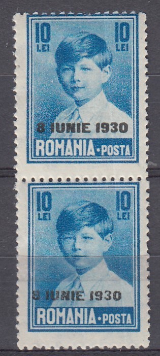 ROMANIA 1930 LP 83 r REGELE MIHAI I CU SUPRATIPAR 8 IUNIE 1930 EROARE VALOAREA 10 LEI ALBASTRU PERECHE PLIU VERSO/CATALOG 1974 KIRIAC DRAGOMIR