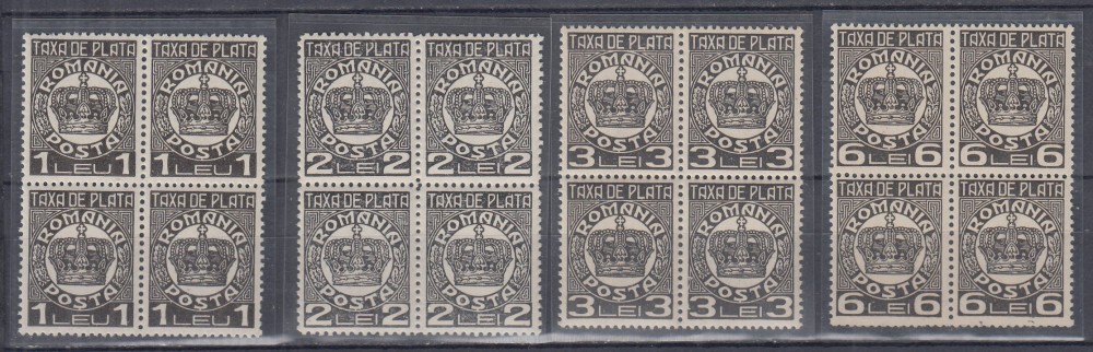 ROMANIA 1932/1938 TAXA DE PLATA COROANA CU FILIGRAN EMISIUNEA I a BLOCURI DE 4 TIMBRE MNH