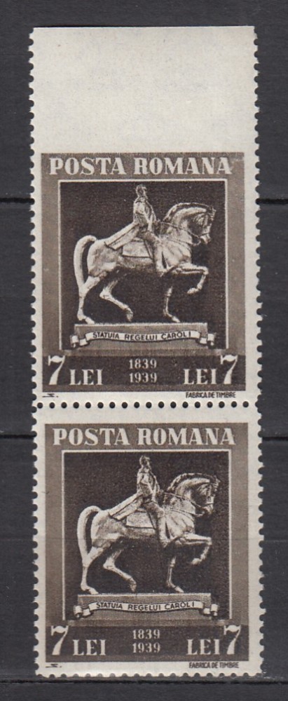 ROMANIA 1938 LP 128 CENTENARUL NASTERII REGELUI CAROL VALOAREA VALOAREA 7 LEI BRUN INCHIS PERECHE EROARE NEDANTELATA ORIZONTAL STARE MNH