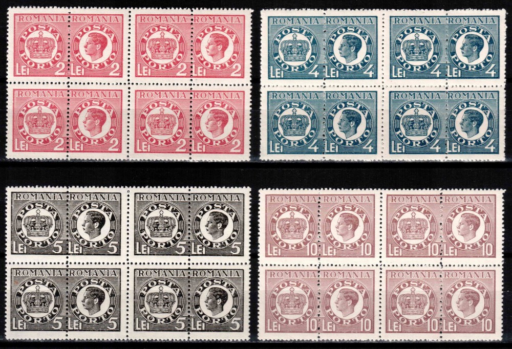 Romania 1947 LP 22, Porto duble - Mihai si Coroana, blocuri de 4, MNH!