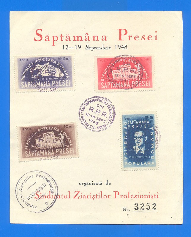 ROMANIA 1948. LP 242 Saptamina presei democrate. Serie pe carton filatelic