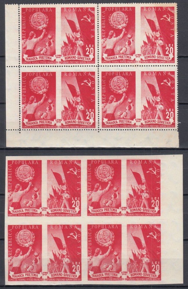 ROMANIA 1949 LP 257 LP 257a PRIETENIA ROMANO-SOVIETICA SERIA IN BLOCURI DE 4 TIMBRE STARE MNH