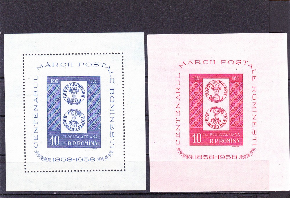 ROMANIA 1958 LP 465 CENTENARUL MARCII POSTALE COLITA NEDANTELATA + DANTELATA MNH
