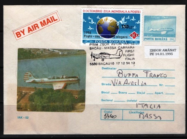ROMANIA 1994 - AVIATIE. PRIM ZBOR AVION IAK-52. PLIC OCAZIONAL, FDCRO6