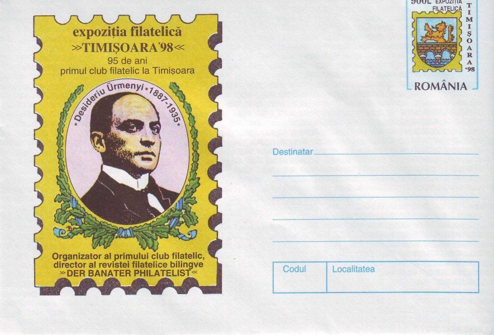 Romania 1998, Expo. Filatelica Timisoara, Desideriu Urmenyi, intreg postal