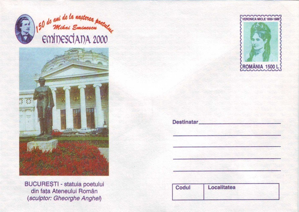 Romania 1999, M. Eminescu, Veronica Micle, Statuia lui Eminescu din fata Ateneului Roman, intreg postal