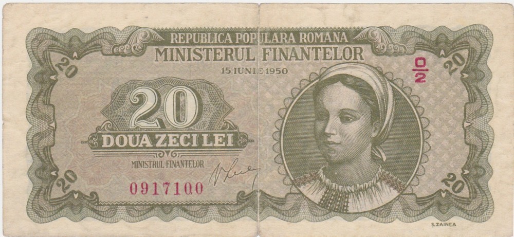 bancnotă 20 lei 1950, Republica Populară Română, Ministerul Finanțelor, RPR, bancnote românești, bancnote comuniste, 20 lei RPR, țăran român, numismatică, colecție bancnote, Ș. Zainea
