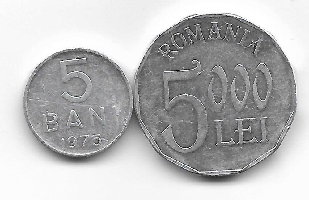 Romania (300) - 5 Bani 1975, 5000 Lei 2002 - monede aluminiu