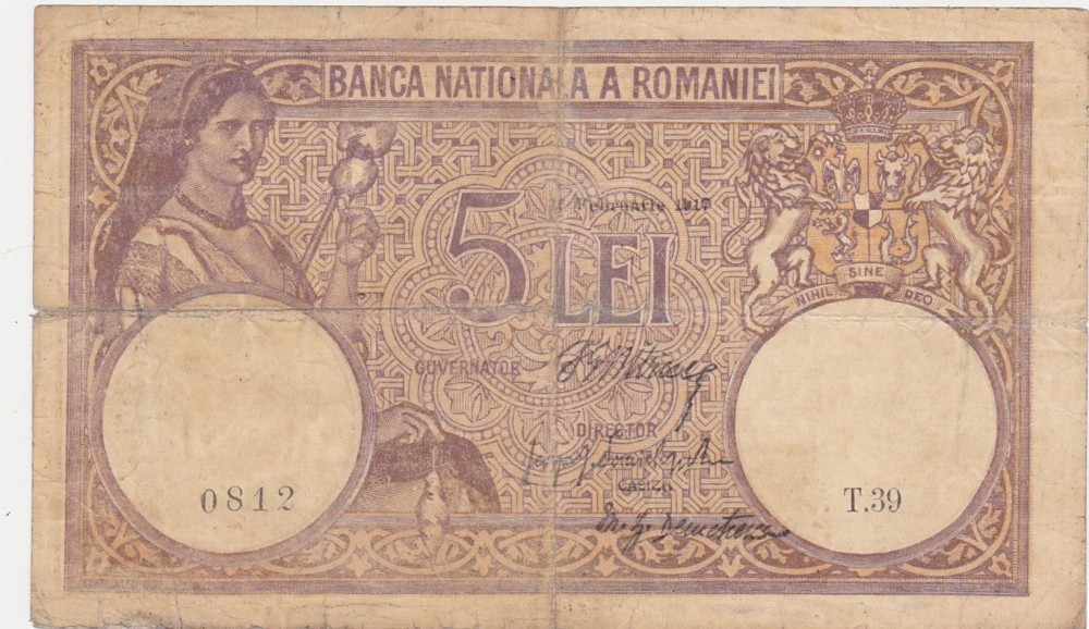 Bancnota ROMANIA 5 LEI August 1917 Fagure Uzata