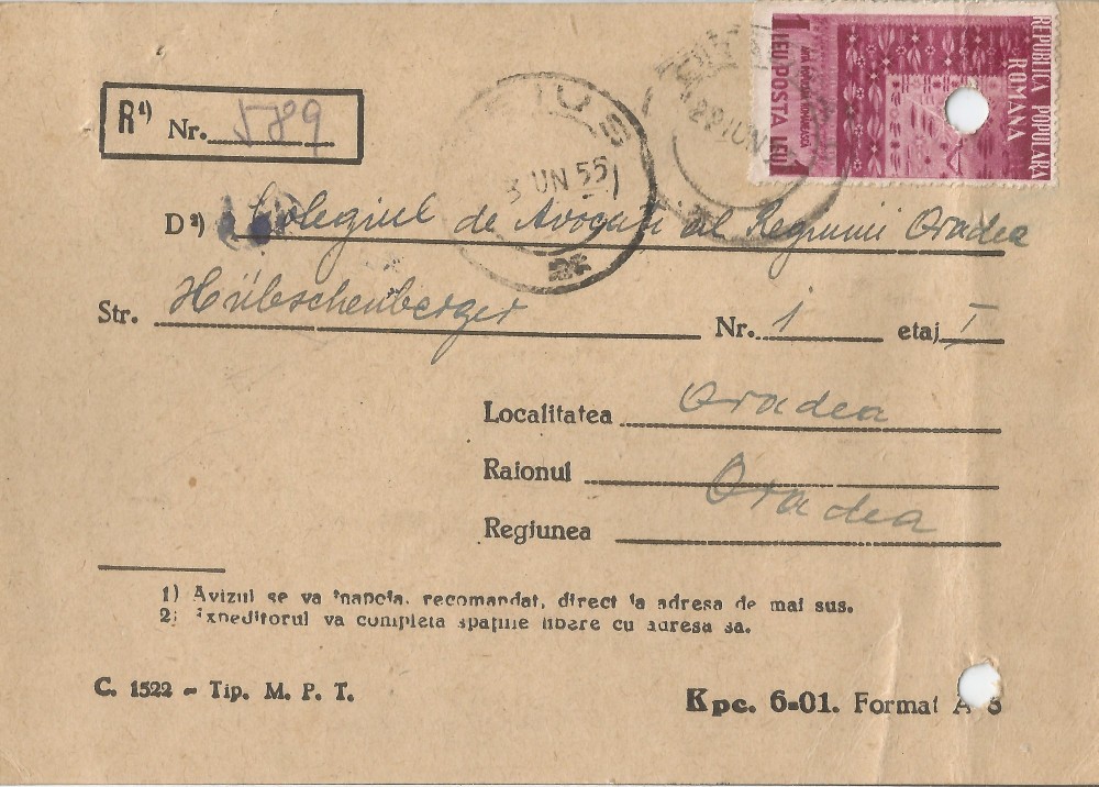 Romania, aviz de primire, recomandat, circulat intern, 1955