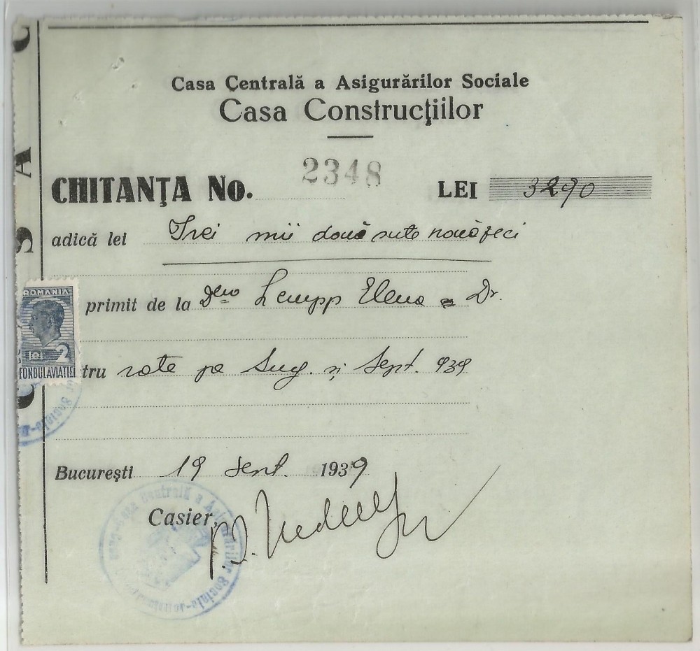 Romania, Casa Centrala a Asigurarilor Sociale, Casa Constructiilor, Chitanta (I), 1939