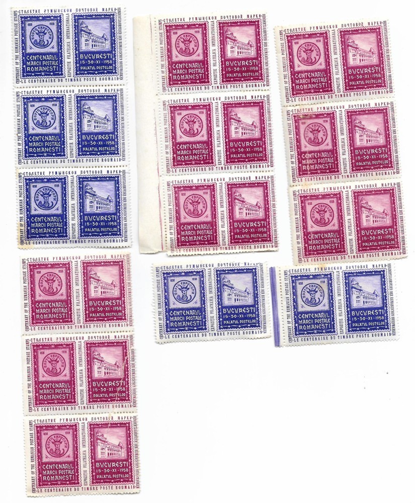 Centenarul marcii postale romanesti, 1958, viniete neobliterate, in blocuri. Stare mediocra sau submediocra. Pretul este pentru intreg lotul de 31 marci.