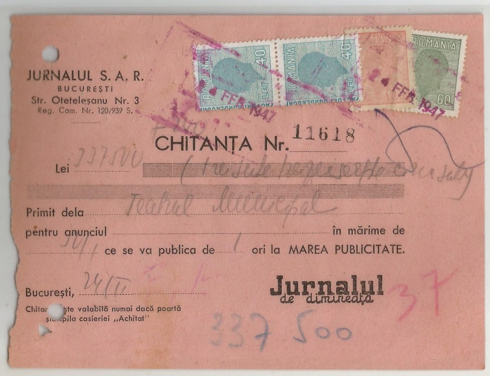 Romania, Jurnalul S.A.R., Chitanta, Bucuresti, 1947