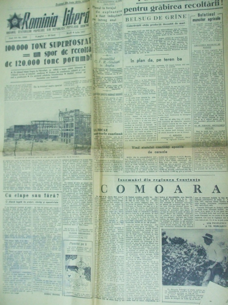 SUMAR : PE TARMUL MARII NEGRE LA NAVODARI SE RIDICA O MARE UZINA CHIMICA. 100 000 TONE SUPERFOSFAT = UN SPOR DE RECOLTA DE 120 000 TONE PORUMB. C.F.R. GIULESTI IN ANGLIA. IN BICAZ SUCCESELE CONTINUA. UN MARE SUCCES AL PETROLISTILOR DIN VALEA CASELOR. BELSUG DE GRANE GALATI ORADEA TIMISOARA. COMOARA VITEI DE VIE DIN CONSTANTA DOBROGEA. CARICATURA CHIRIAC FACHIRUL.