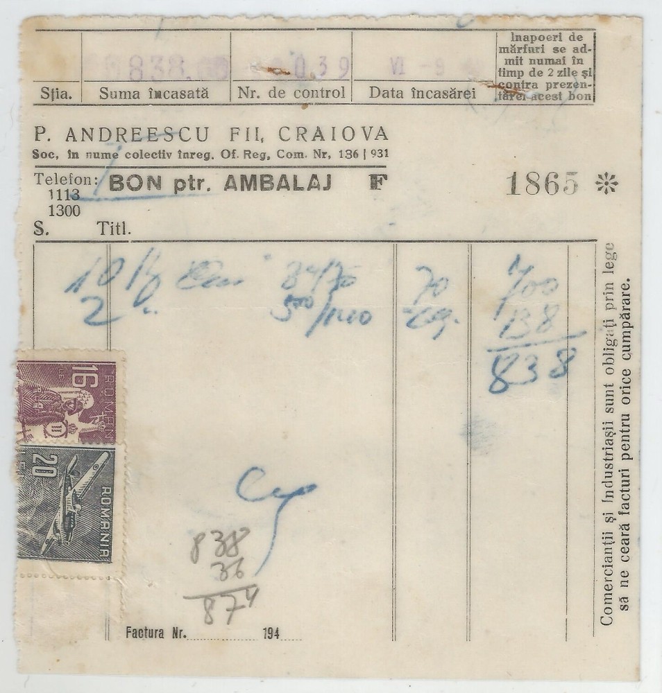 Romania, P. Andreescu Fii, Bon pentru ambalaj, Craiova