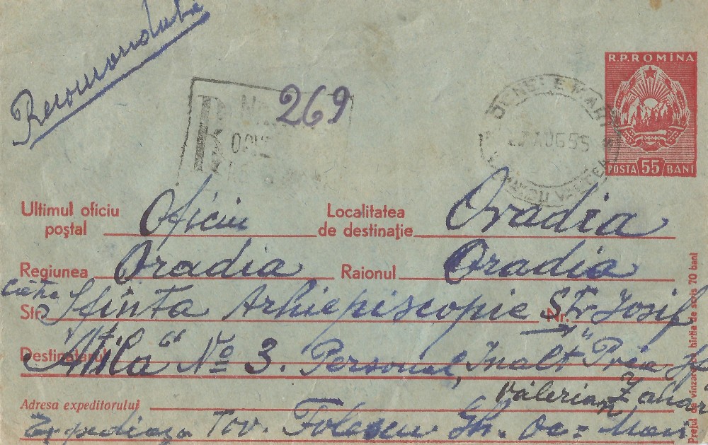 intreg postal recomandat, circulat intern pe ruta Ocnele Mari -