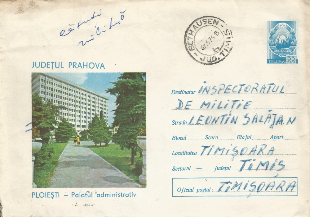 intreg postal circulat intern pe ruta Bethausen - Timisoara, 1974;