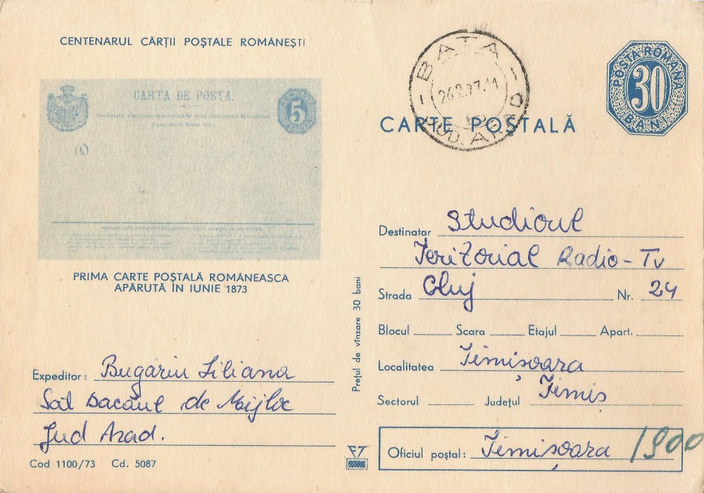 carte postala, circulata intern pe ruta Bata - Timisoara, 1977