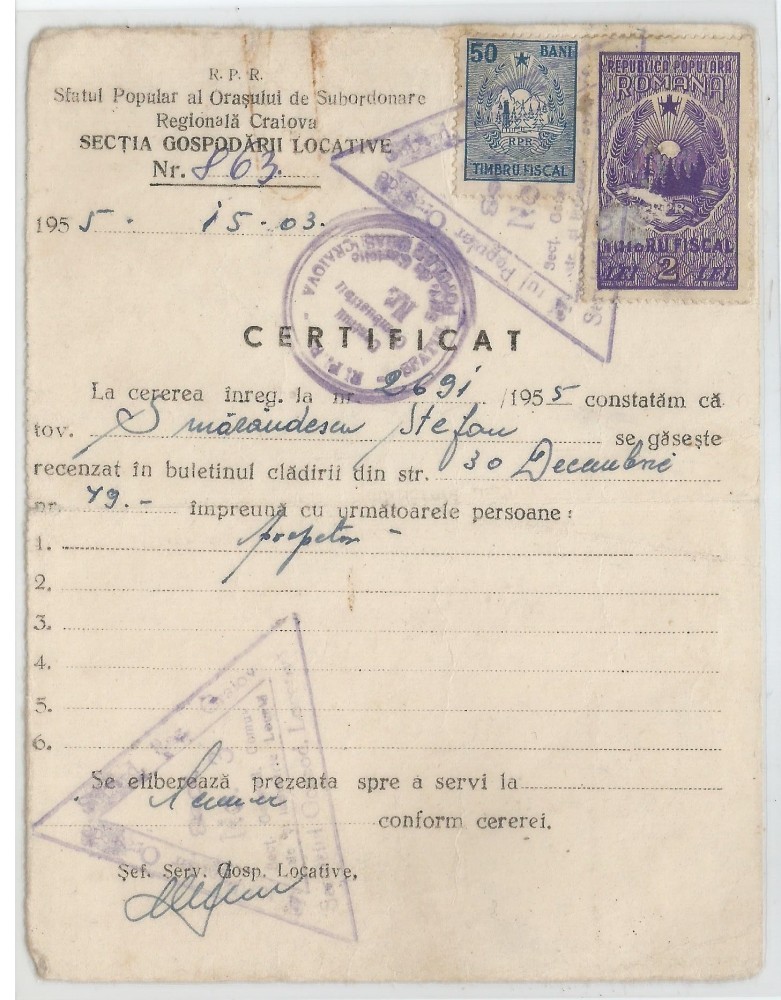 Romania, Sfatul Popular al Orasului de Subordonare Regionala, Sectia Gospodarii locative, Certificat, Craiova, 1955